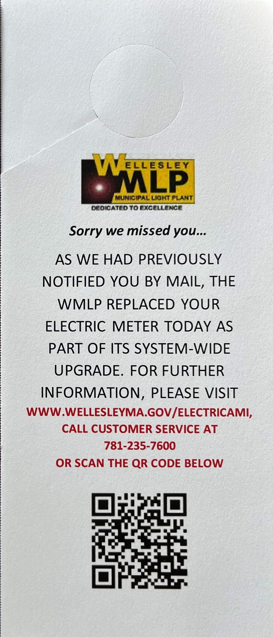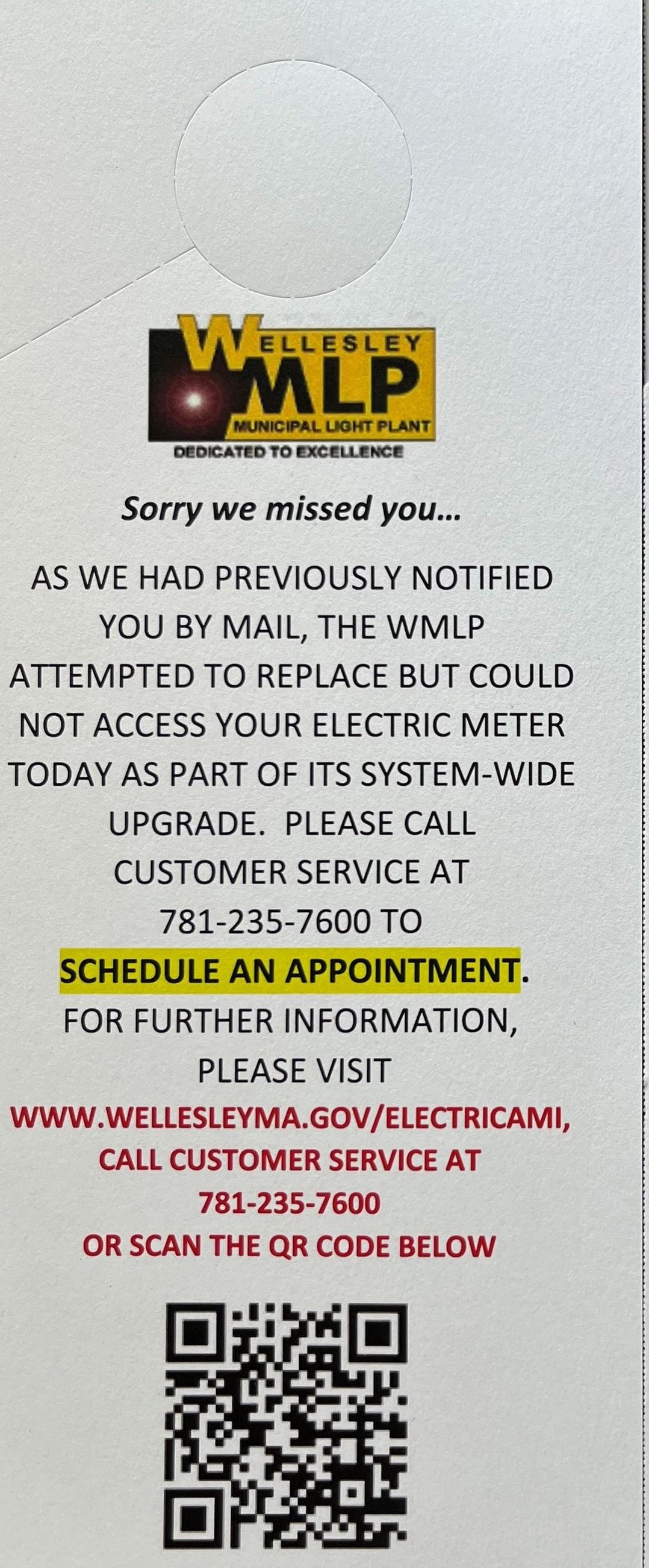 If we cannot safely access your electric meter or it is located inside your home or business, the WMLP will leave a door hanger and need to schedule an appointment with you for the installation. For inside installation, an adult (18 years old minimum) must be present. The area around the electric meter must be accessible to the installer.