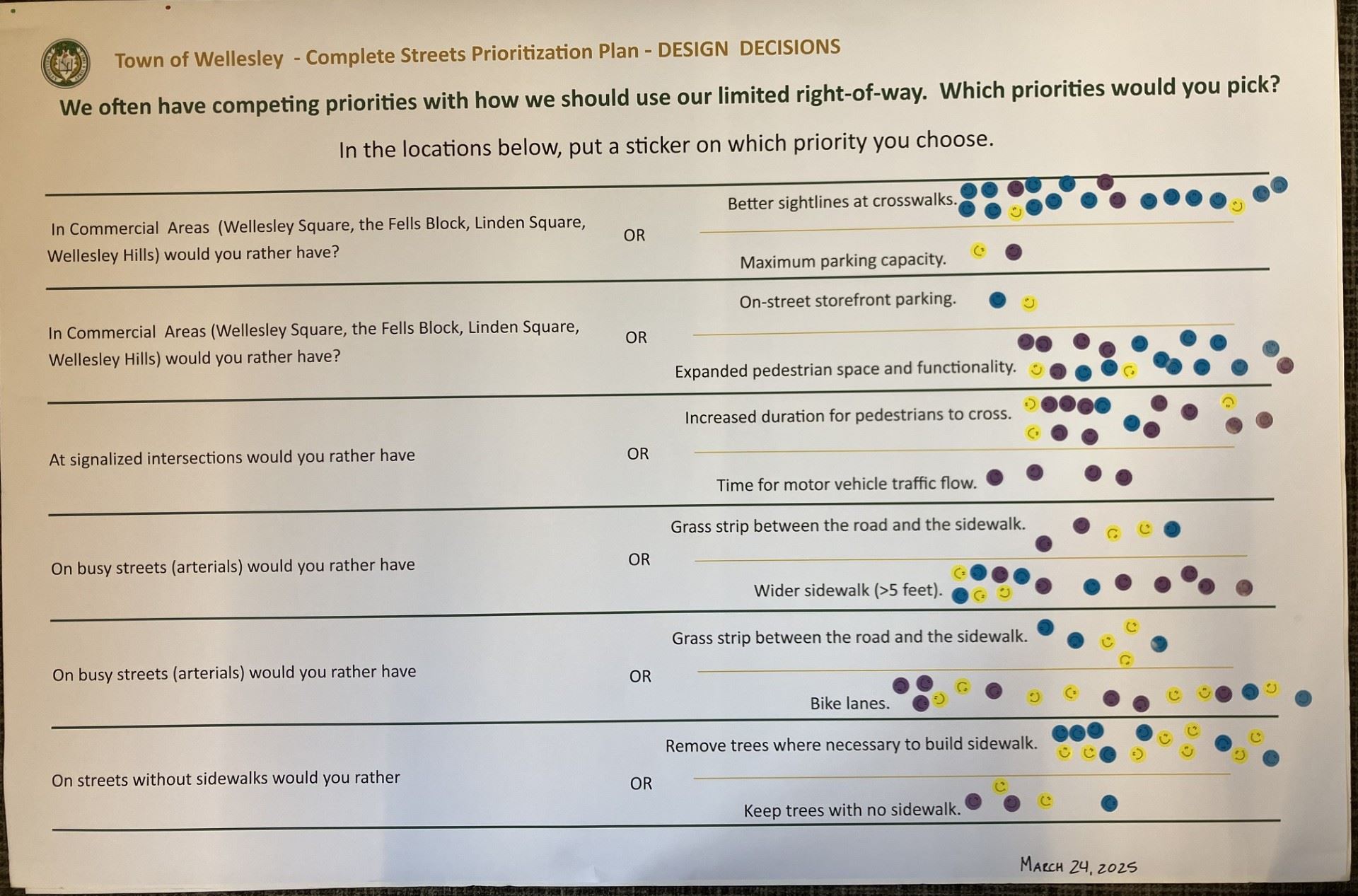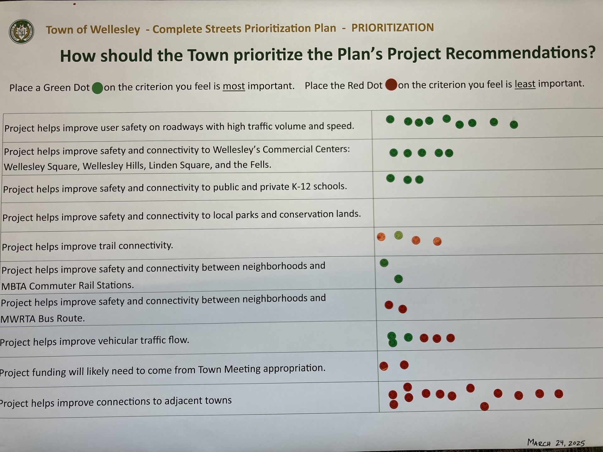 - We held a public meeting on March 24, 2025 . The slide presentation included preliminary survey results as the survey closed March 28. At the meeting, attendees showed their preference of how project should be prioritized . Attendees also provided opinions on design trade-offs when considering projects.